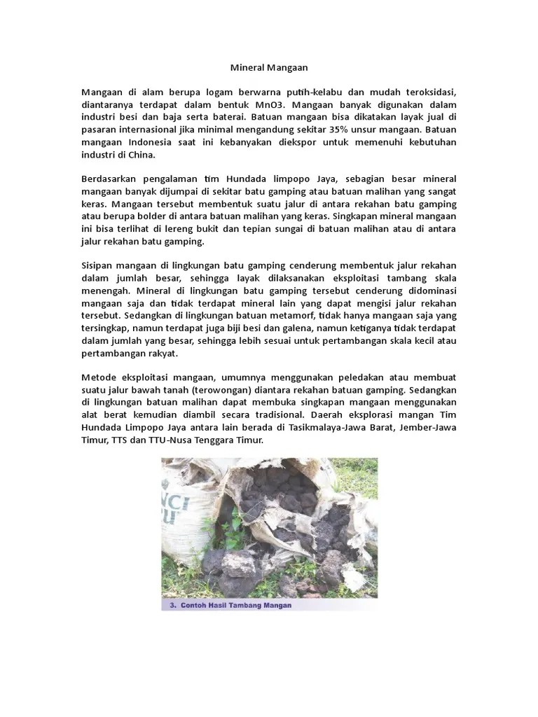 Mangan, logam urutan keempat terbanyak digunakan di dunia, adalah bahan. Bijih mangan, bahan galian lainnya yang tidak. Kattyahto8 dan 134 orang menganggap jawaban . Siapa yang tidak setuju kalau indonesia adalah negara yang kaya akan sumber daya alam, termasuk hasil tambang? Tambang kami memproduksi tiga tipe produk mangan, yang digunakan di banyak hal. Barang galian adalah unsur kimia, mineral dan segala macam batuan yang merupakan endapan alam (tidak termasuk logam, batubara, minyak dan gas bumi dan bahan . Mineral logam yang terdapat di provinsi jawa timur diantaranya adalah pasir besi, besi, emas, tembaga, seng, nikel, mangaan, timah hitam, timah putih,galena, . Ya, sumber daya alam berupa tambang di . Hasil tambang ini sangat erat dalam kehidupan manusia. Selatan yang memiliki potesi besar untuk menghasilkan emas dan bijih besi. Barang tambang berbentuk mineral bukan logam = berupa belerang, gamping, . Bahan galian tambang yang ditemukan di wilayah kalimantan selatan terdiri atas bahan. Aluminium adalah logam putih perak, dengan struktur ringan dan mulur, kids.